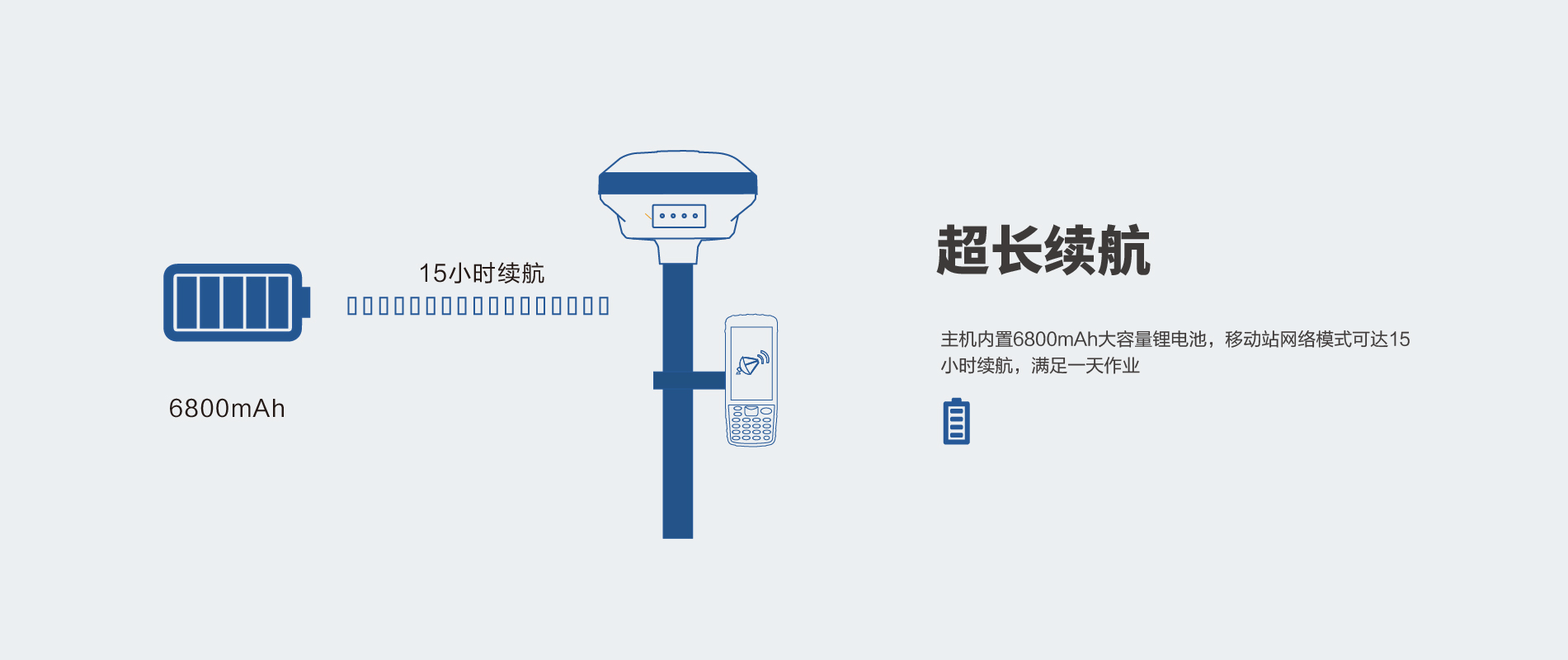 內(nèi)置6800mAh鋰電池,支持移動站15小時(shí)續(xù)航 |